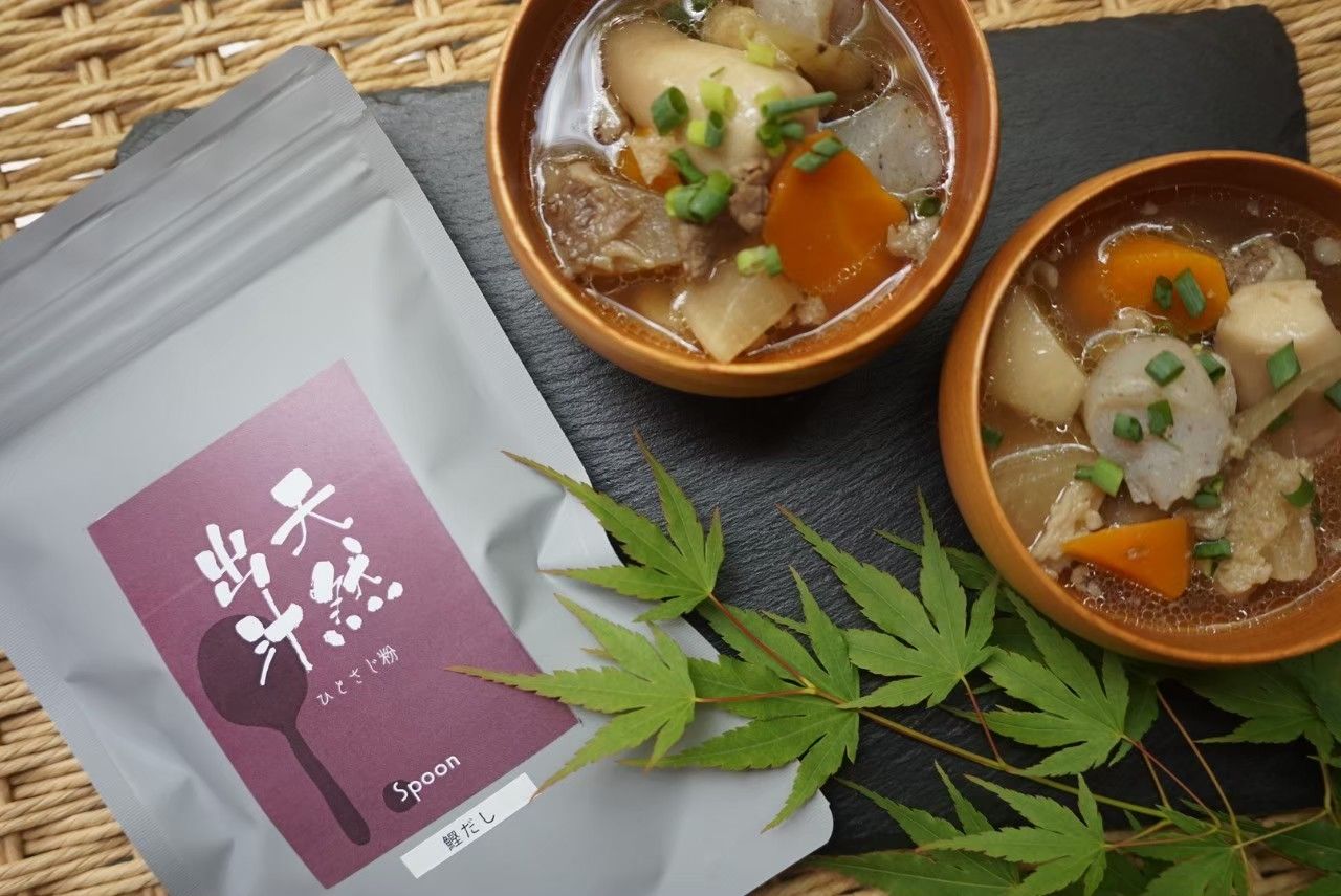 原材料:食塩、砂糖、風味原料(かつお節、いわし煮干し、さば節、昆布、椎茸)、調味料(アミノ酸等)、粉末醤油、野菜エキス、たん白加水分解物、酵母エキス(原料の一部に小麦、大豆を含む)