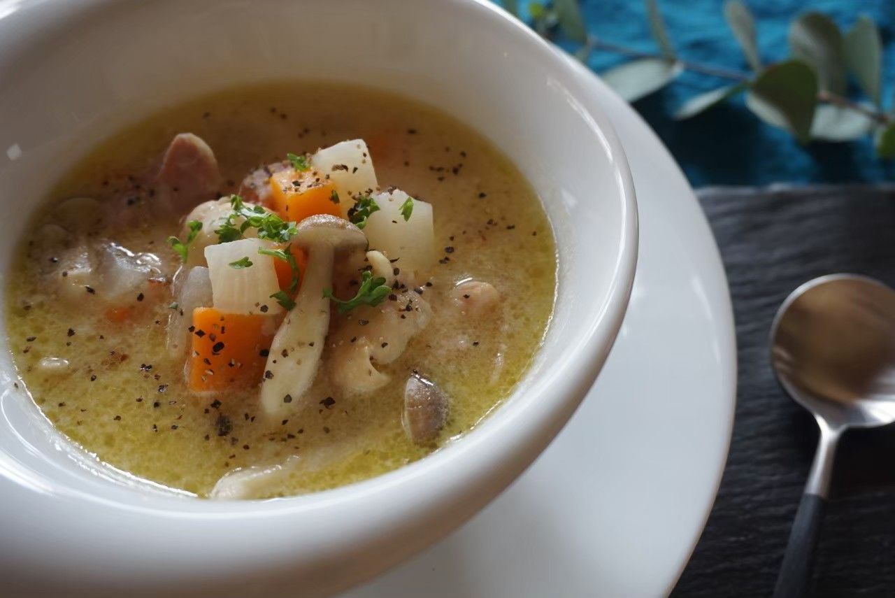 タマネギとセロリを煮出して作った、野菜の旨みが凝縮された美味しいブイヨン。