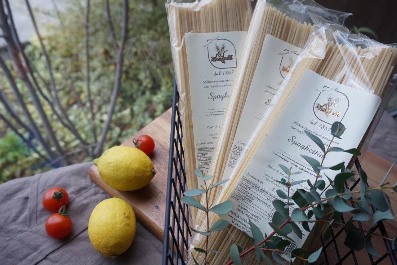品質の高い「水」で名高いアブルッツォ州。山脈の国立公園の麓で、5代に亘り、山麓の天然水と厳選した小麦でパスタを作っているパスタ工房(パスティフィーチョ)で作られています。